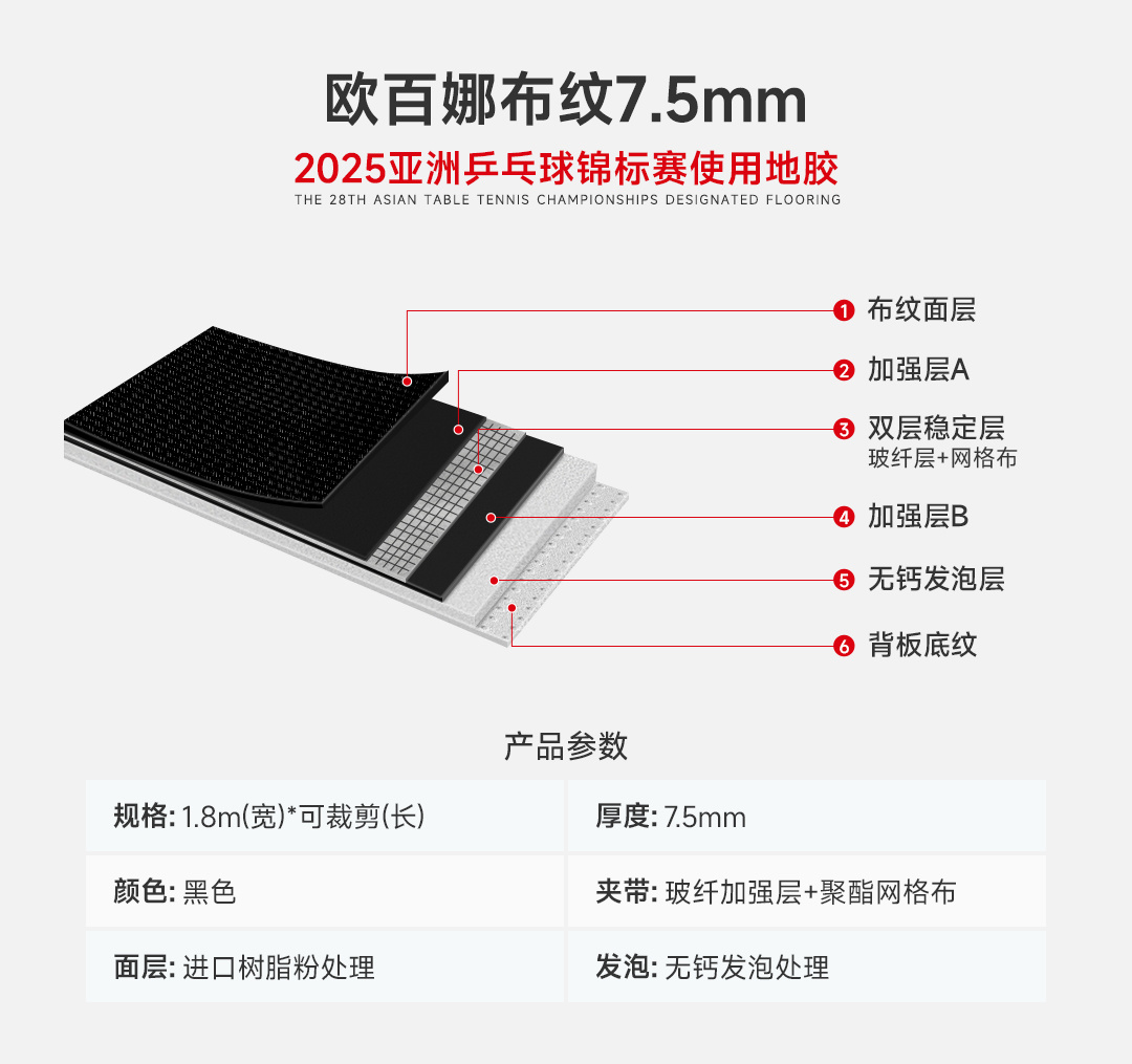 欧百娜全程助力本次赛事,赞助乒乓球场地专用地胶——欧百娜布纹7.5mm铺设大赛场地。该产品是以亚锦赛场地作为需